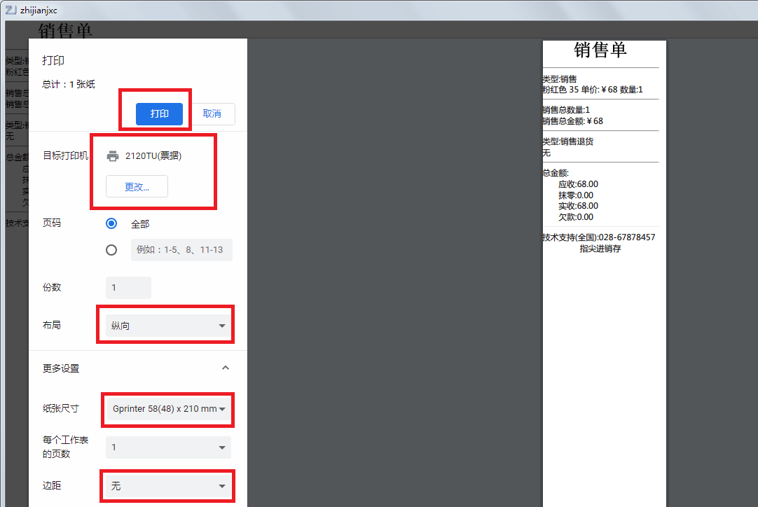 點(diǎn)擊“更改”按鈕選擇打印機(jī)(ZJ-6801選擇2120TU票據(jù),ZJ-6802選擇A831票據(jù))——布局選“縱向”——紙張尺寸選“58*210mm”——邊距選擇“無(wú)”——預(yù)覽無(wú)誤后,點(diǎn)擊左上方“打印”按鈕。